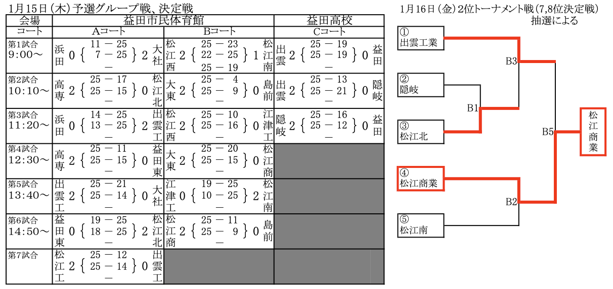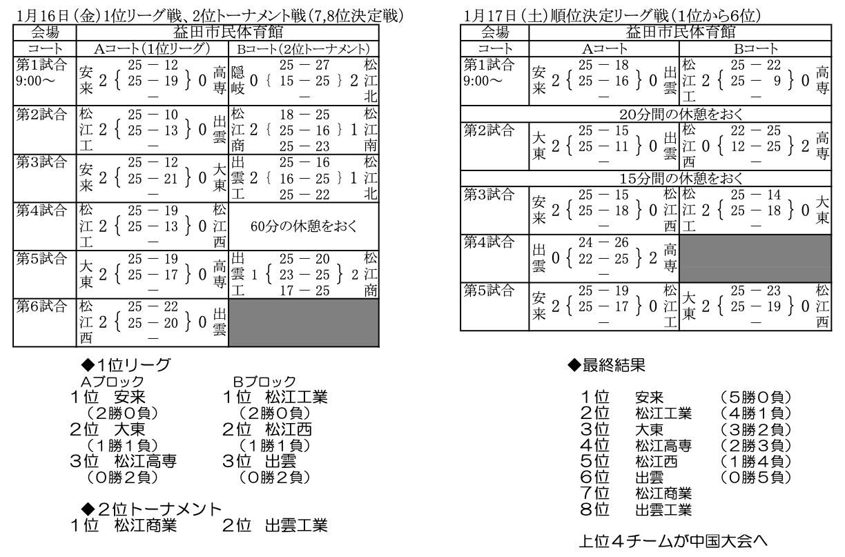 | 安 来 | 2 | 25-19 25-17 | 0 | 松江工業 |