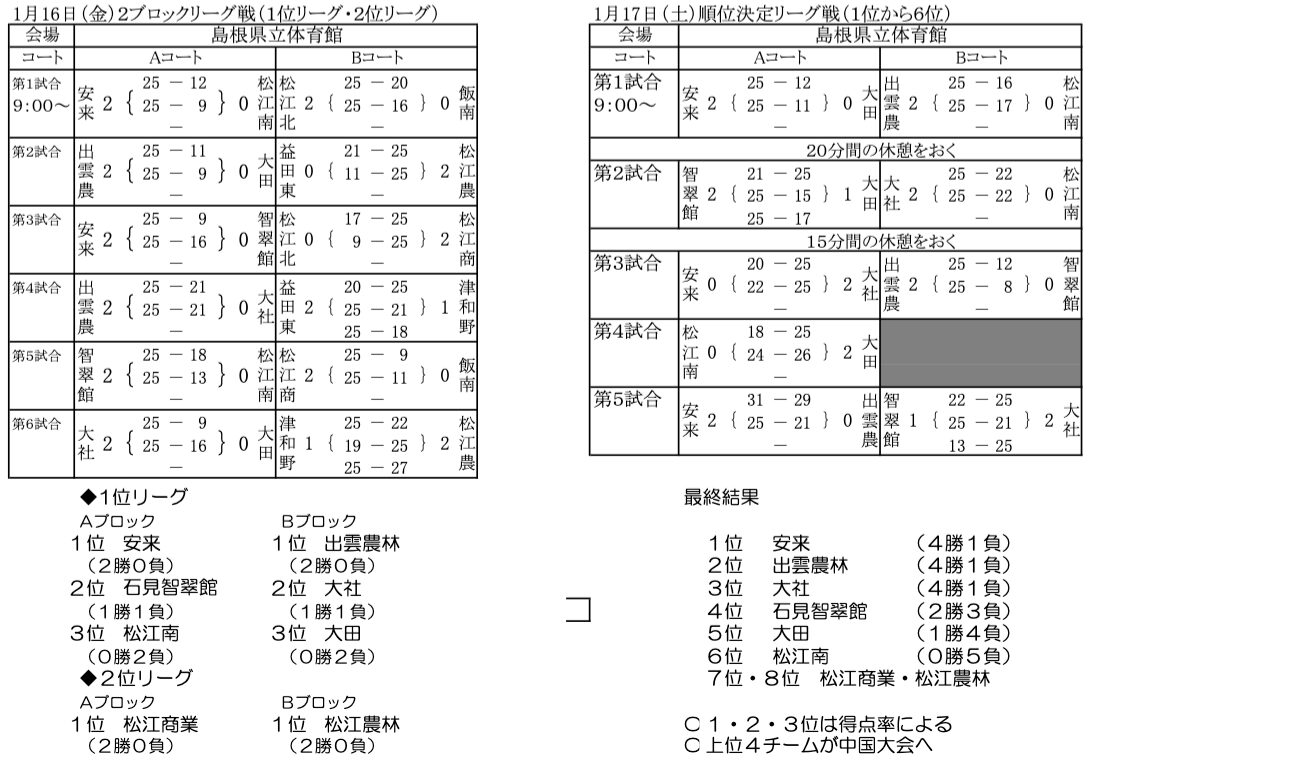 | 安 来 | 2 | 25-9 25-16 | 0 | 石見智翠館 |