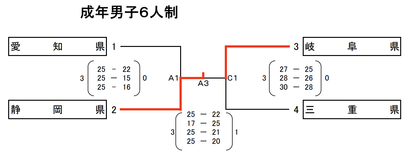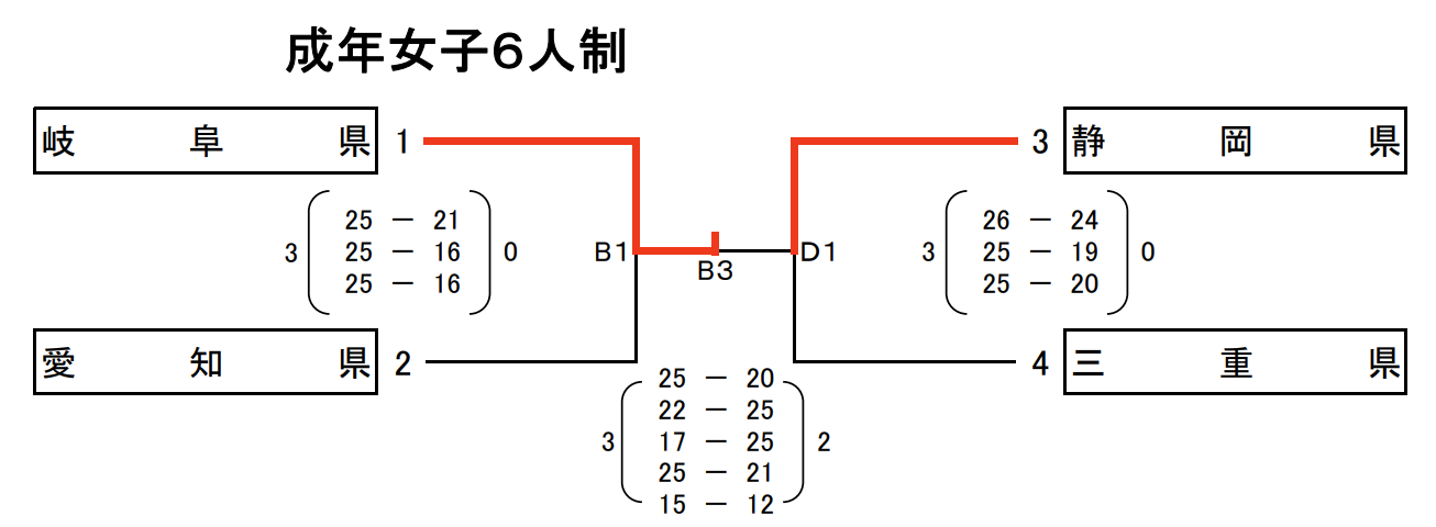 | 岐阜県 | 3 | 25-21 25-16 25-16 | 0 | 愛知県 |