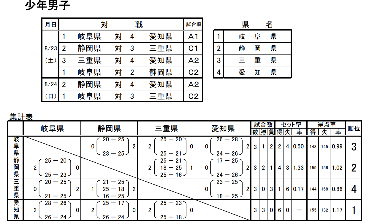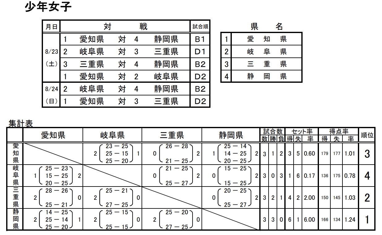 | 愛知県 | 1 | 25-14 14-25 20-25 | 2 | 静岡県 |