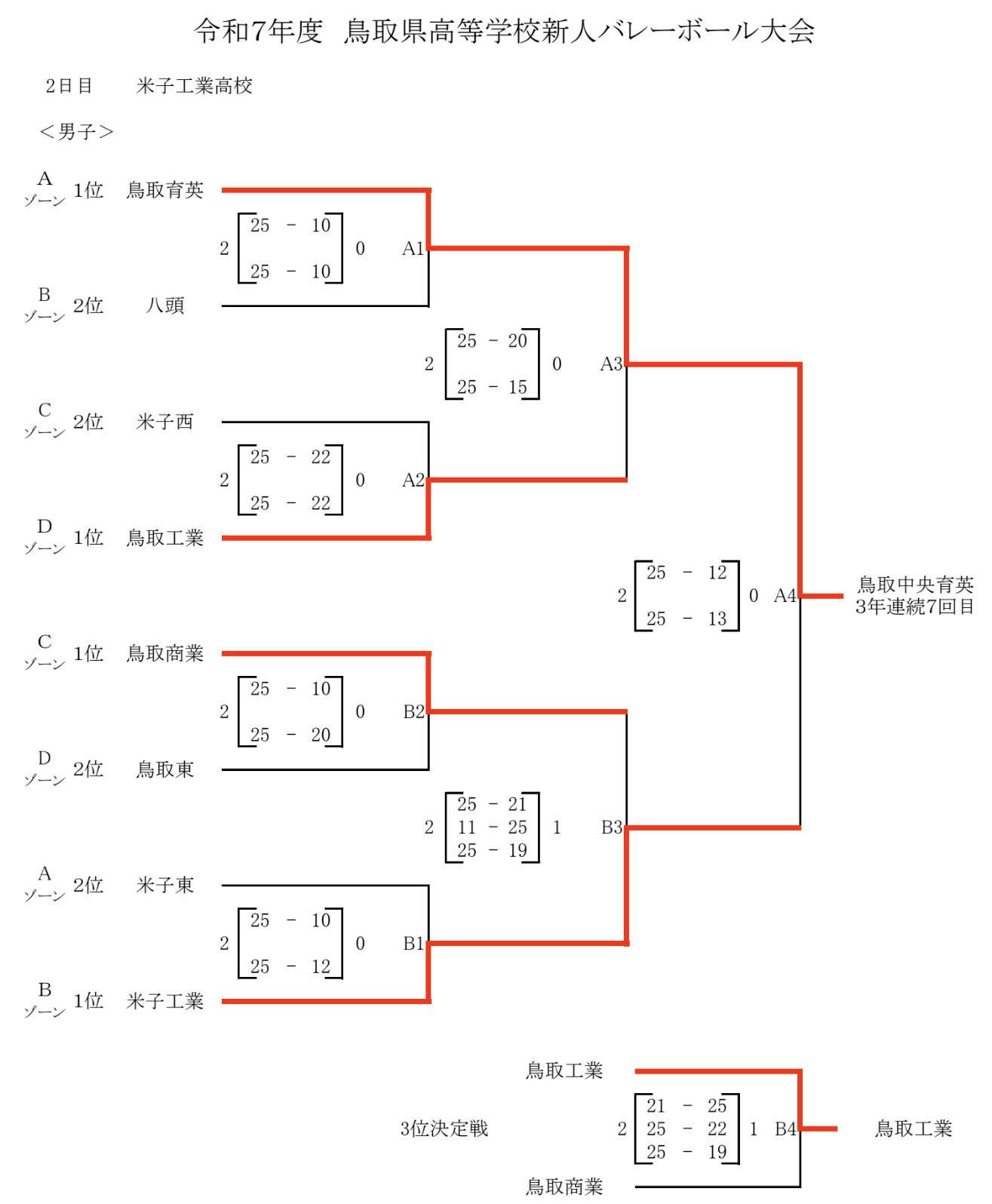 | 鳥取育英 | 2 | 25-20 25-15 | 0 | 鳥取工業 |