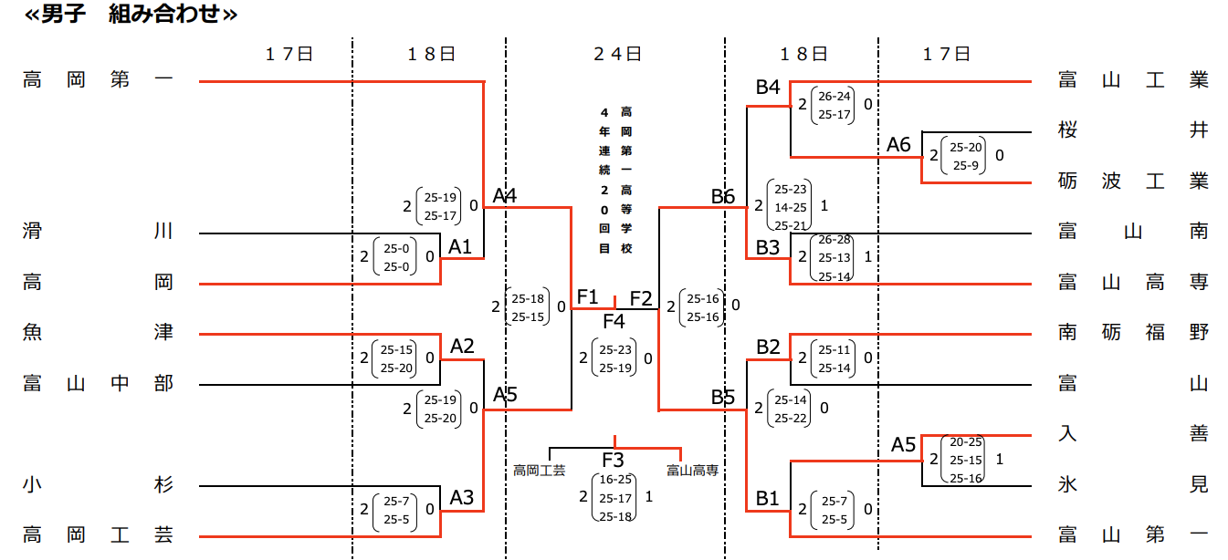 | 高岡第一 | 2 | 25-18 25-15 | 0 | 高岡工芸 |
