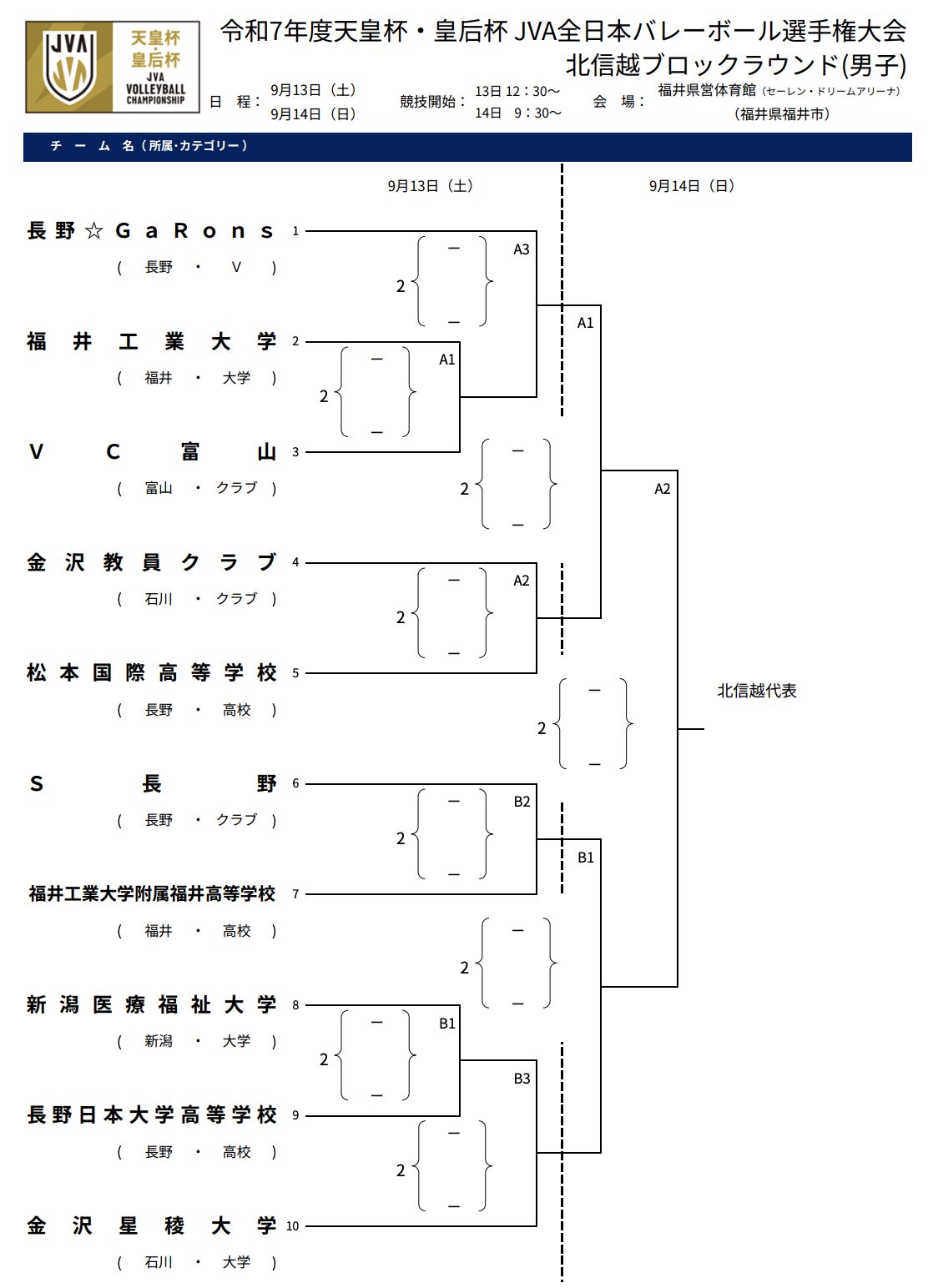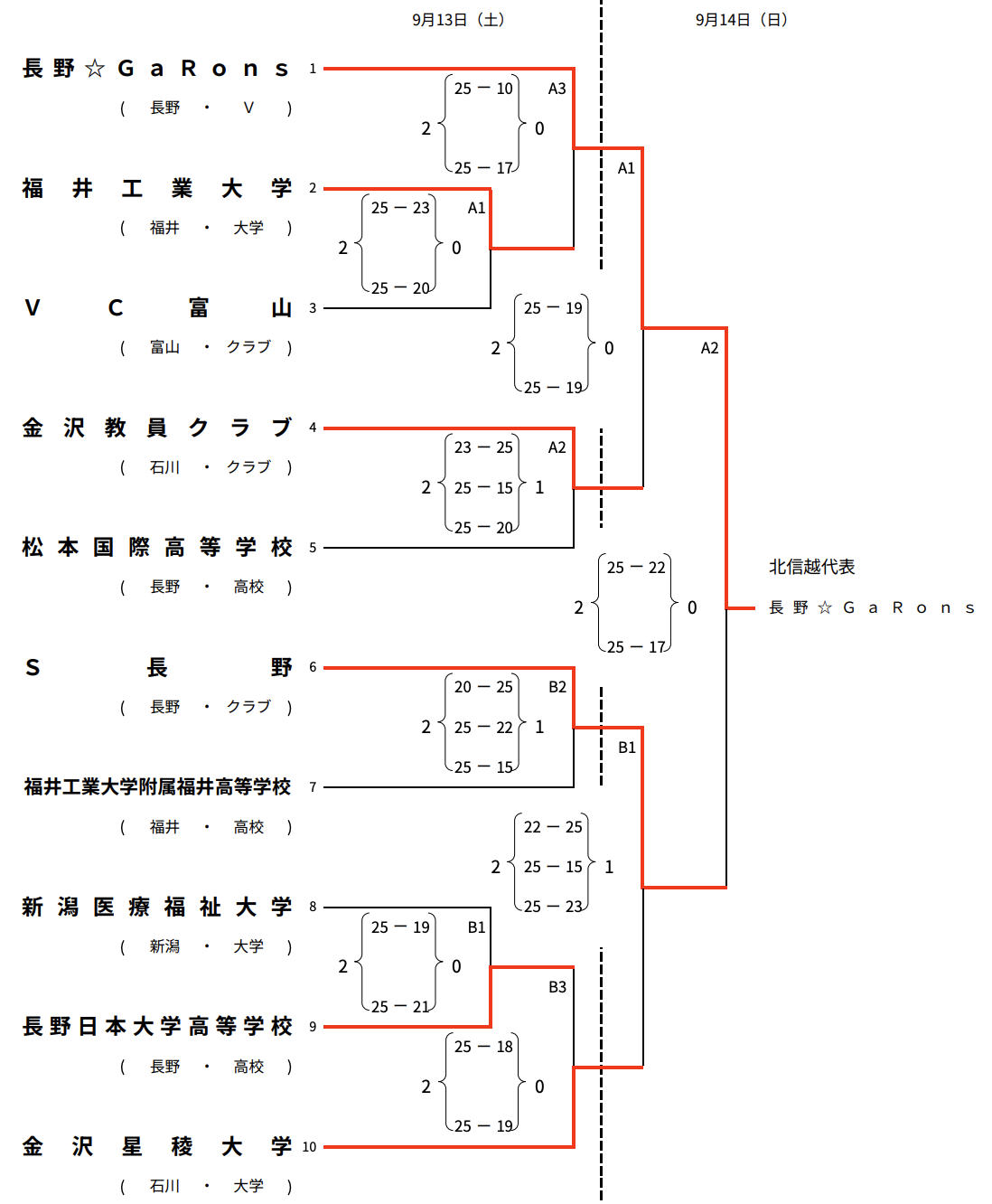 | 金沢教員クラブ (石川/クラブ) | 1 | 25-23 15-25 20-25 | 2 | 松本国際高校 (長野/高校) |
