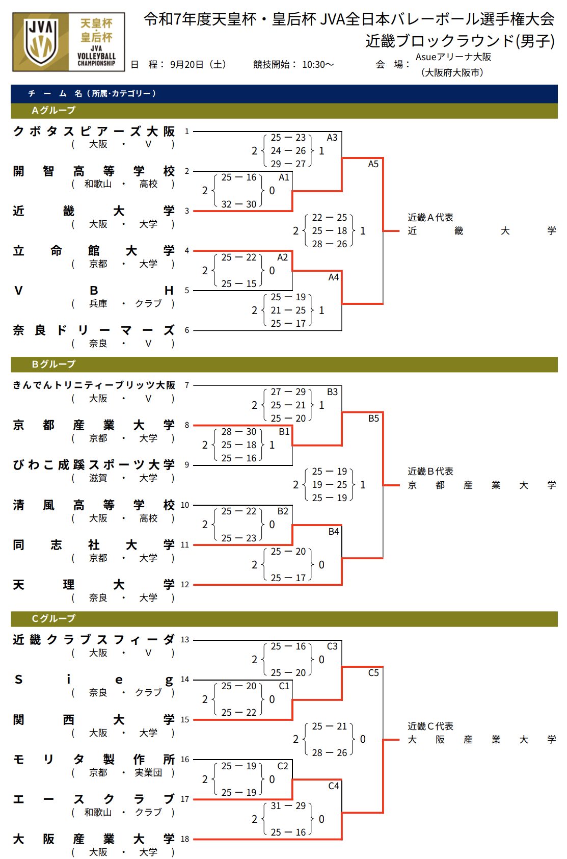 | 京都産業大学 (京都/大学) | 2 | 25-19 19-25 25-19 | 1 | 天理大学 (奈良/大学) |