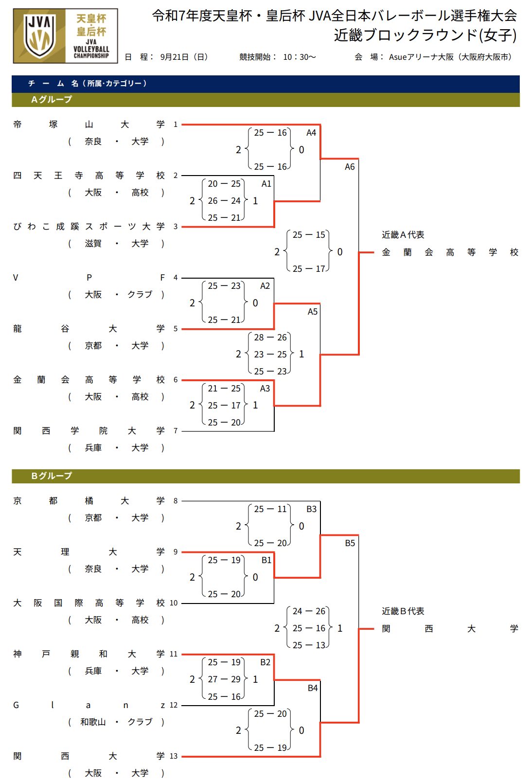 | 金蘭会高校 (大阪/高校) | 2 | 21-25 25-17 25-20 | 1 | 関西学院大学 (大阪/大学) |