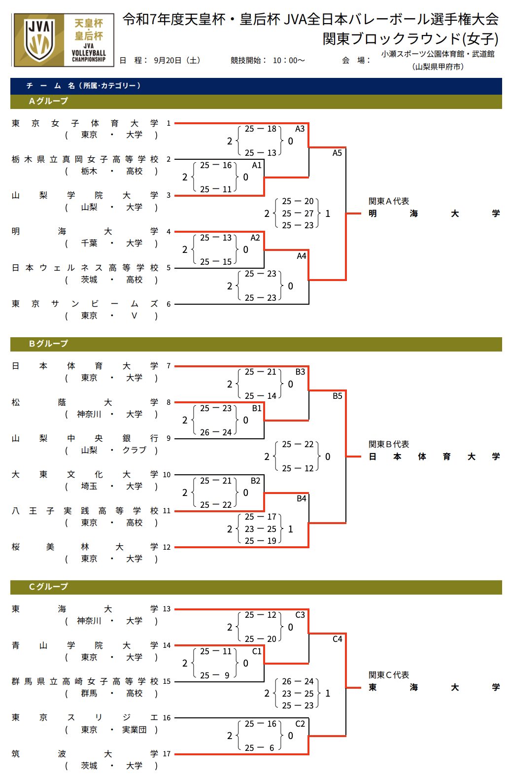 | 山梨大学 (東京/大学) | 2 | 25-19 25-9 | 0 | 前橋商業高校 (東京/高校) |