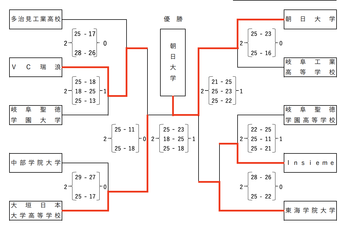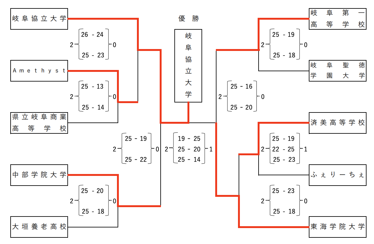 | 岐阜第一高校 | 2 | 25-19 25-18 | 0 | 岐阜聖徳学園大学 |