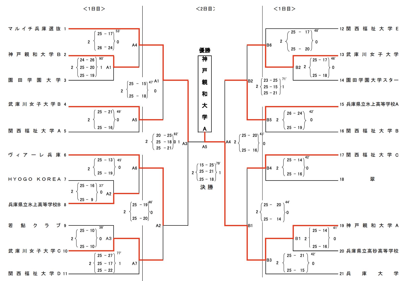| 神戸親和大学A | 2 | 25-21 25-15 | 0 | 兵庫大学 |