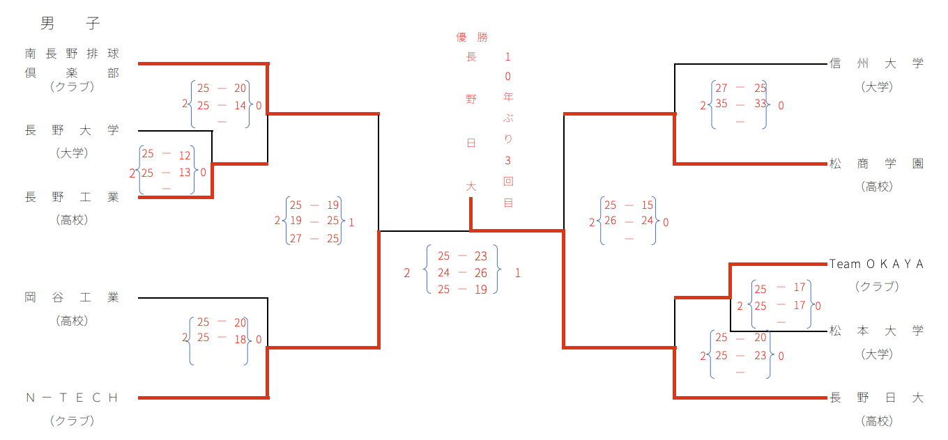 長野日大高校 | 1 | 23-25 25-23 12-25 | 2 | 東海大学諏訪高校 |