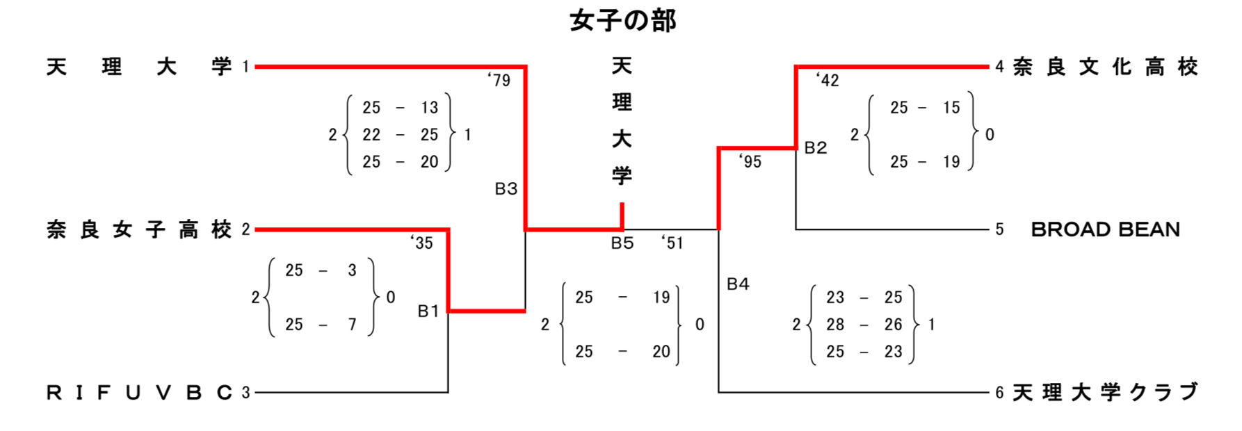 | 天理大学 | 2 | 25-13 22-25 25-20 | 1 | 奈良女子高校 |