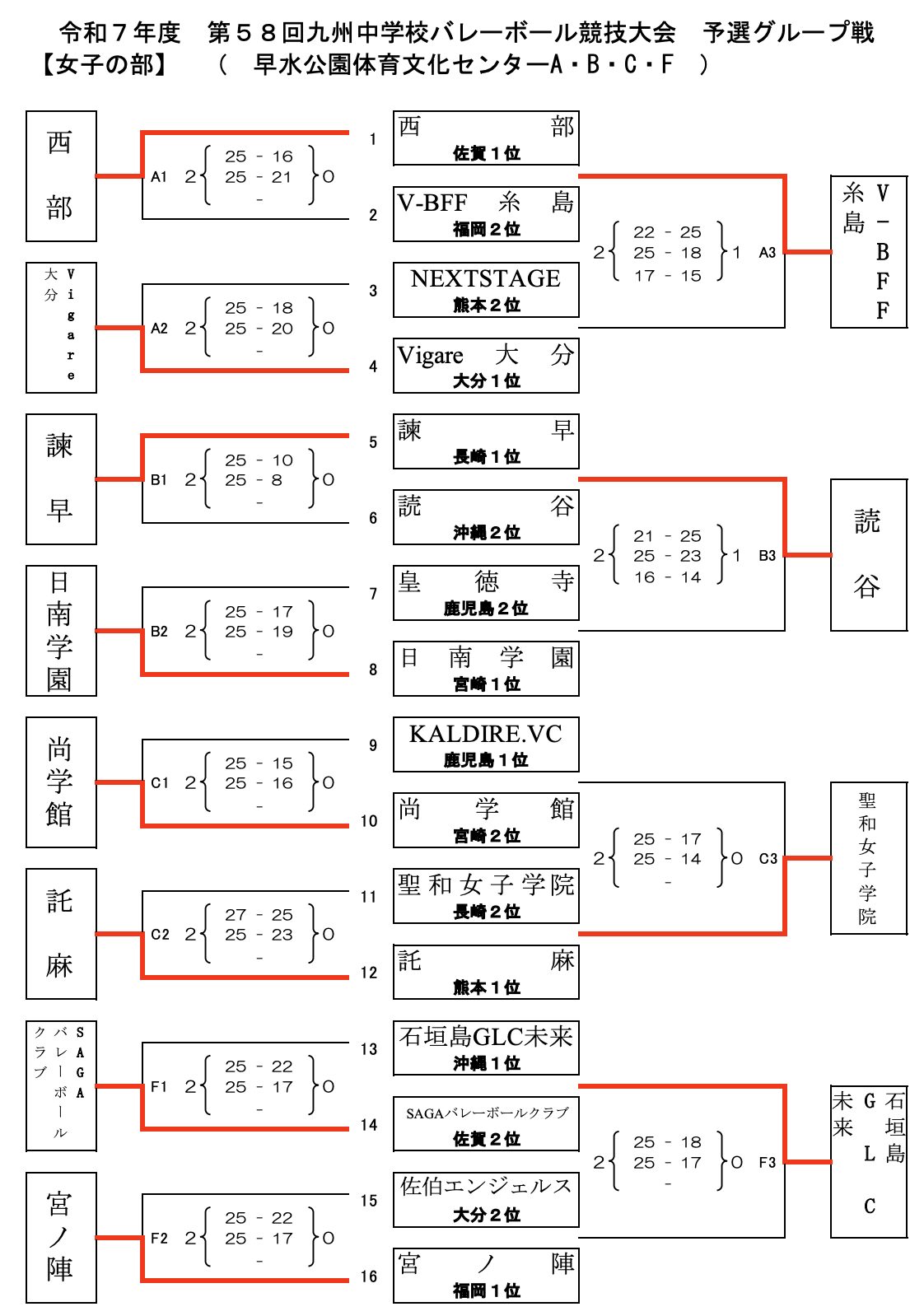 | 西 部 (佐賀県1位) | 2 | 24-26 25-13 27-25 | 1 | 託 麻 (熊本県1位) |