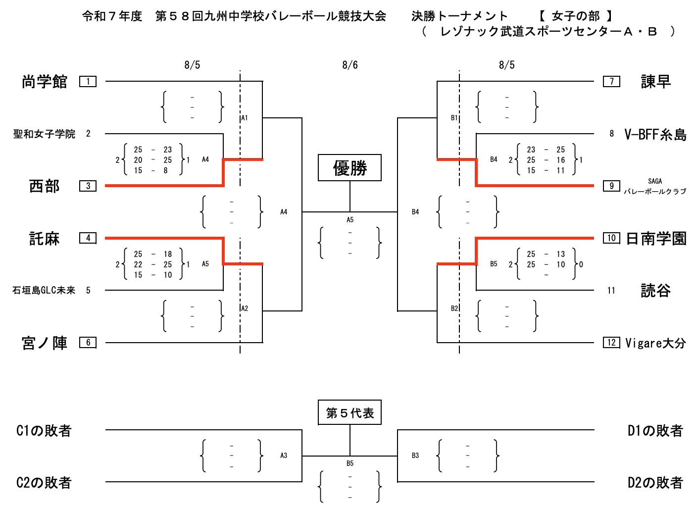 | 尚学館 (宮崎県2位) | 2 | 25-20 17-25 25-19 | 1 | 西 部 (佐賀県1位) |