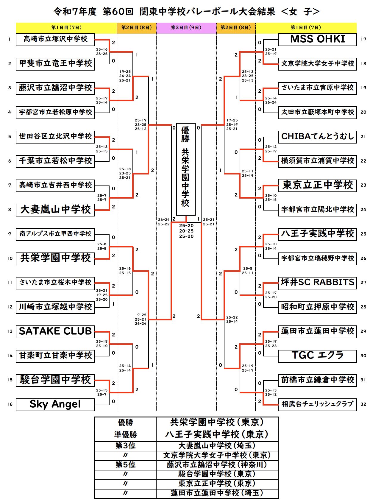| 共栄学園 (東京5位) | 2 | 25-16 25-15 | 0 | さいたま桜木 (埼玉4位) |