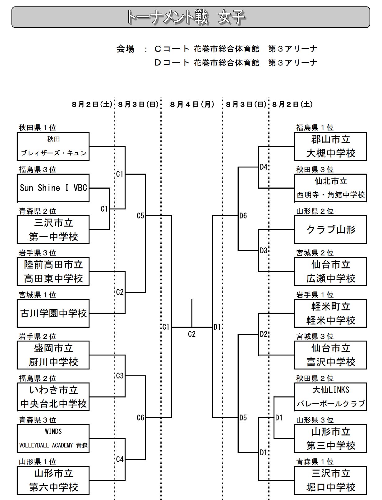 | 中央台北 (福島2位) | 0 | 18-25 22-25 | 2 | 山形第六 (山形1位) |