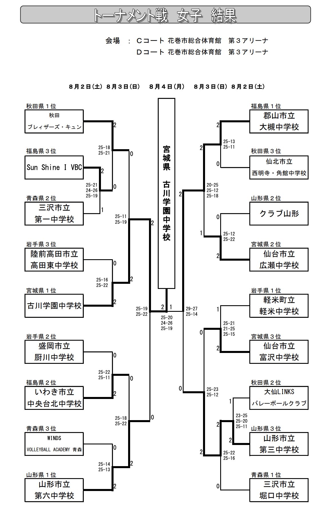| 厨 川 (岩手2位) | 0 | 22-25 11-25 | 2 | 中央台北 (福島2位) |