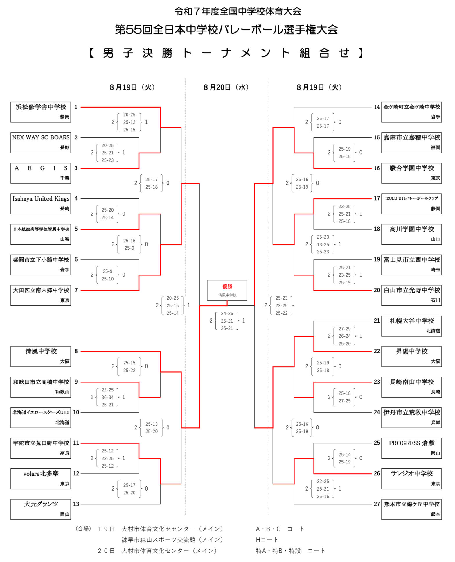 | 清 風 (近畿1/大阪) | 2 | 24-26 25-21 25-21 | 1 | 駿台学園 (関東2/東京) |