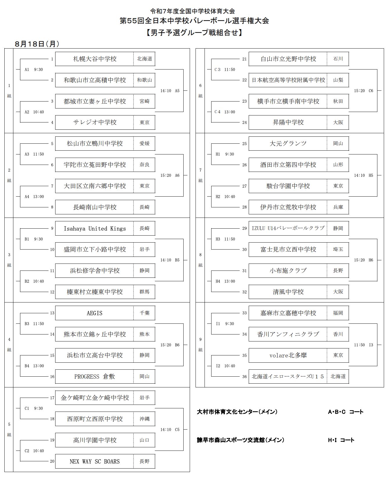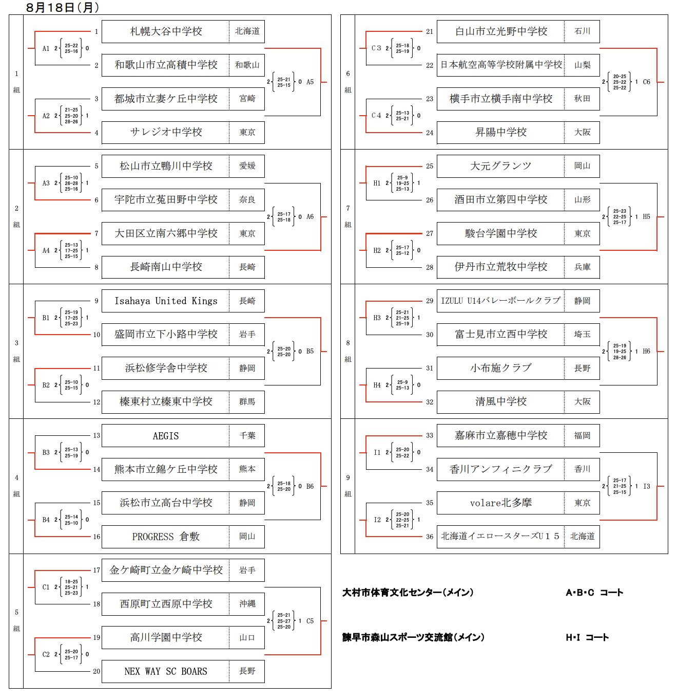 | 南六郷 (関東1/東京) | 2 | 25-13 17-25 25-15 | 1 | 長崎南山 (九州3/長崎) |