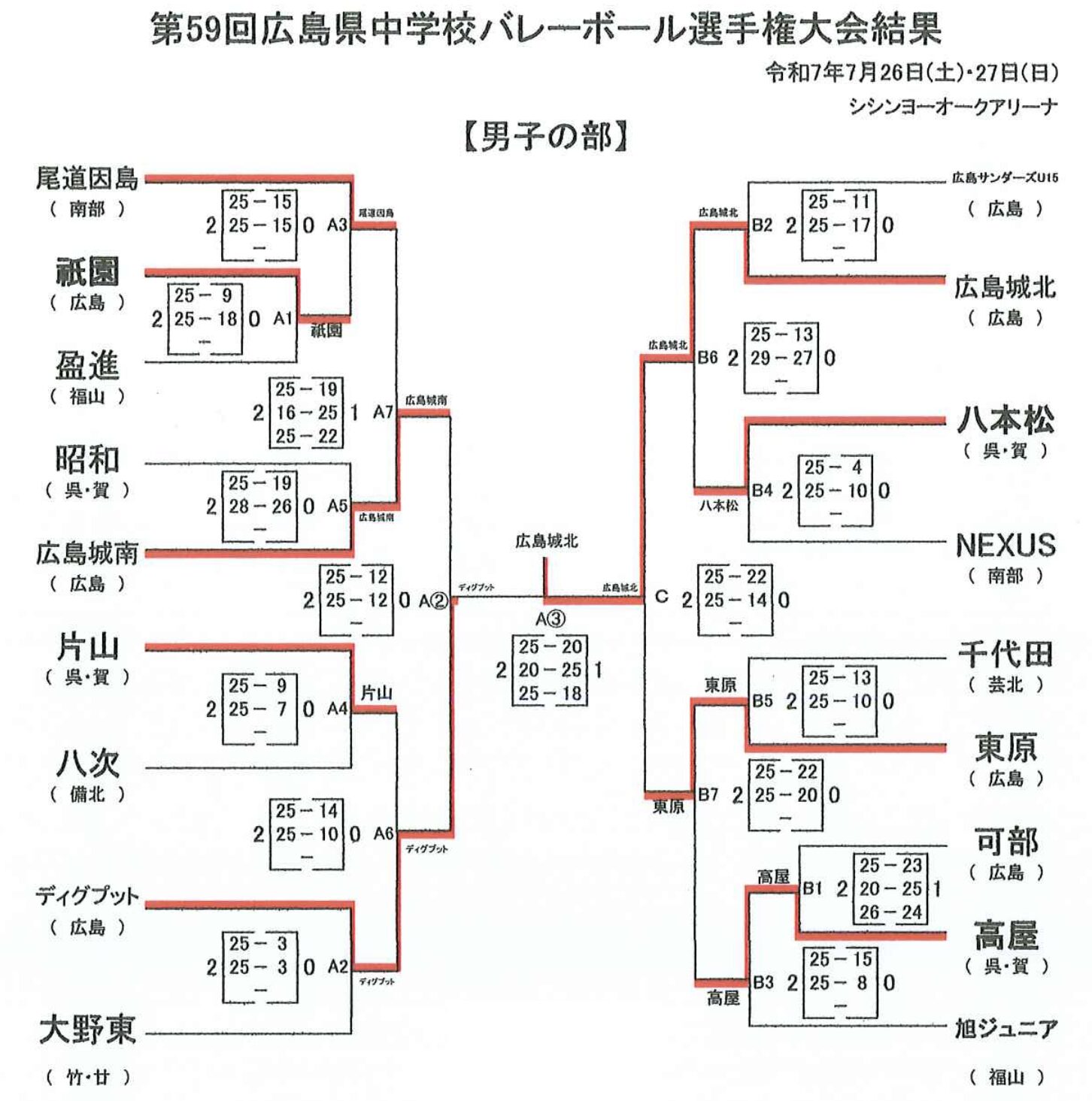 | 広島サンダーズU15 | 0 | 11-25 17-25 | 2 | 広島城北 |