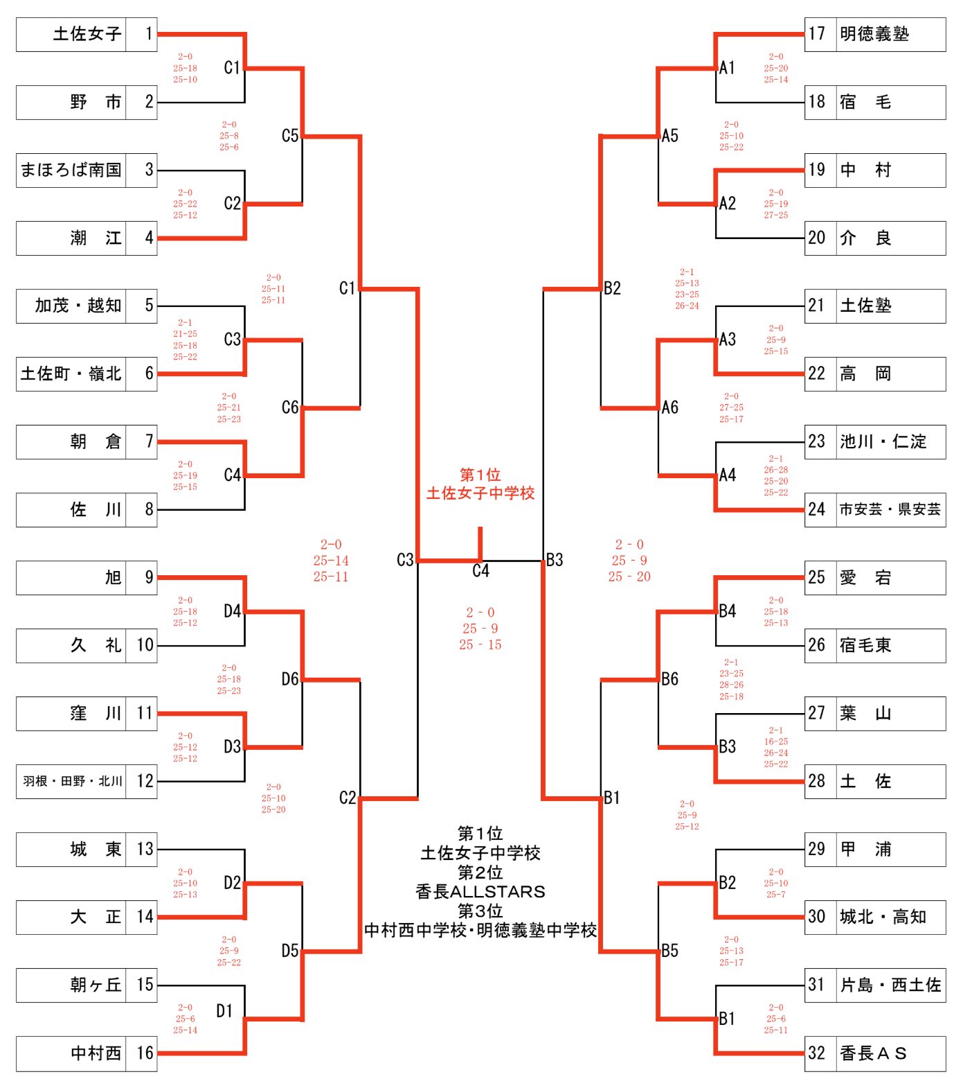 | 土佐塾 | 0 | 9-25 15-25 | 2 | 高 岡 |