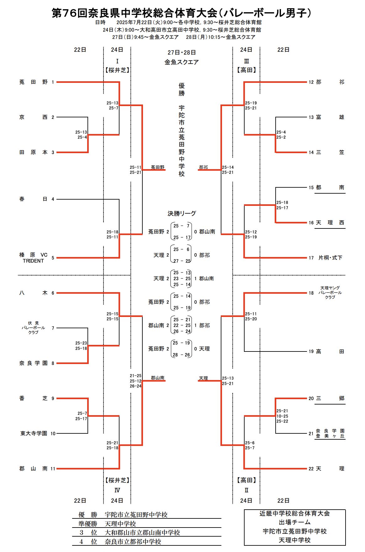奈良県で開催されています『令和7年度 第55回全日本中学校バレーボール選手権大会県予選』男子の全ての試合が終了しました。