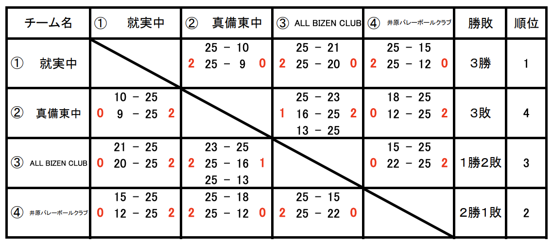 | ALL BIZEN CLUB | 2 | 23-25 25-16 25-13 | 1 | 真備東 |