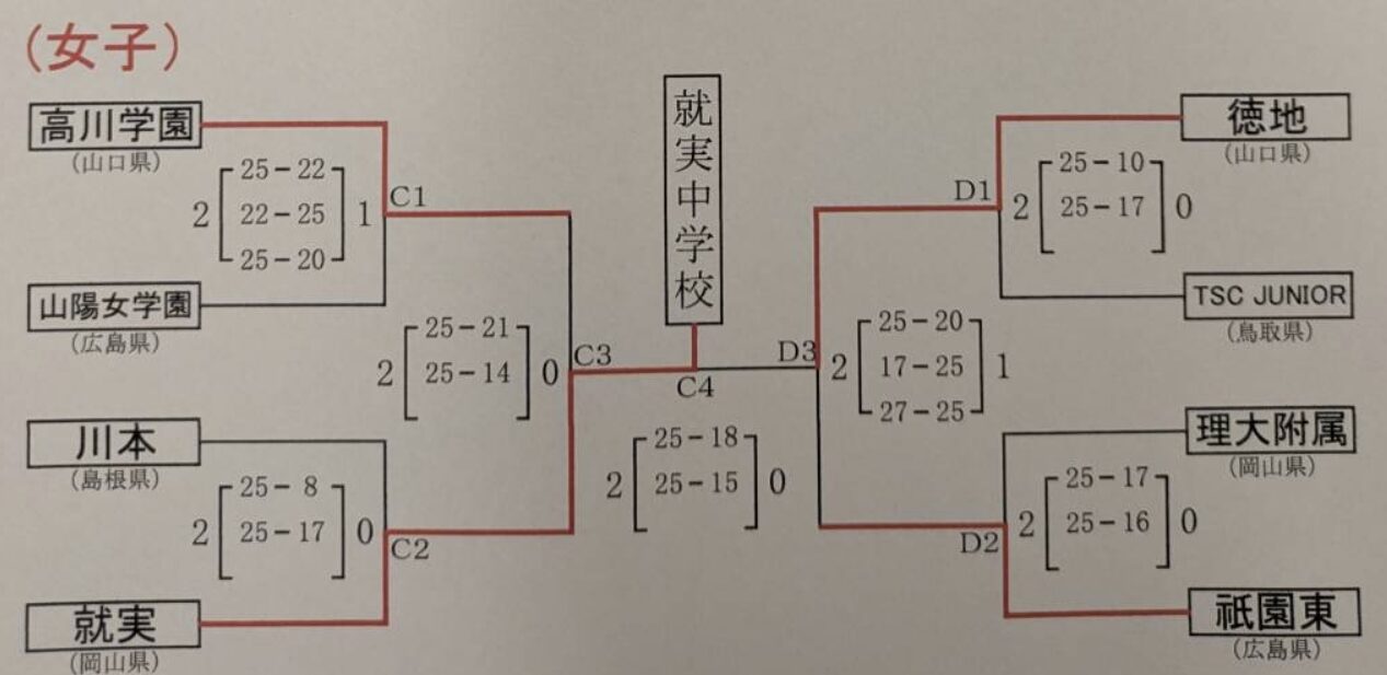 | 理大附属 (岡山県) | 0 | 17-25 16-25 | 2 | 祇園東 (広島県) |