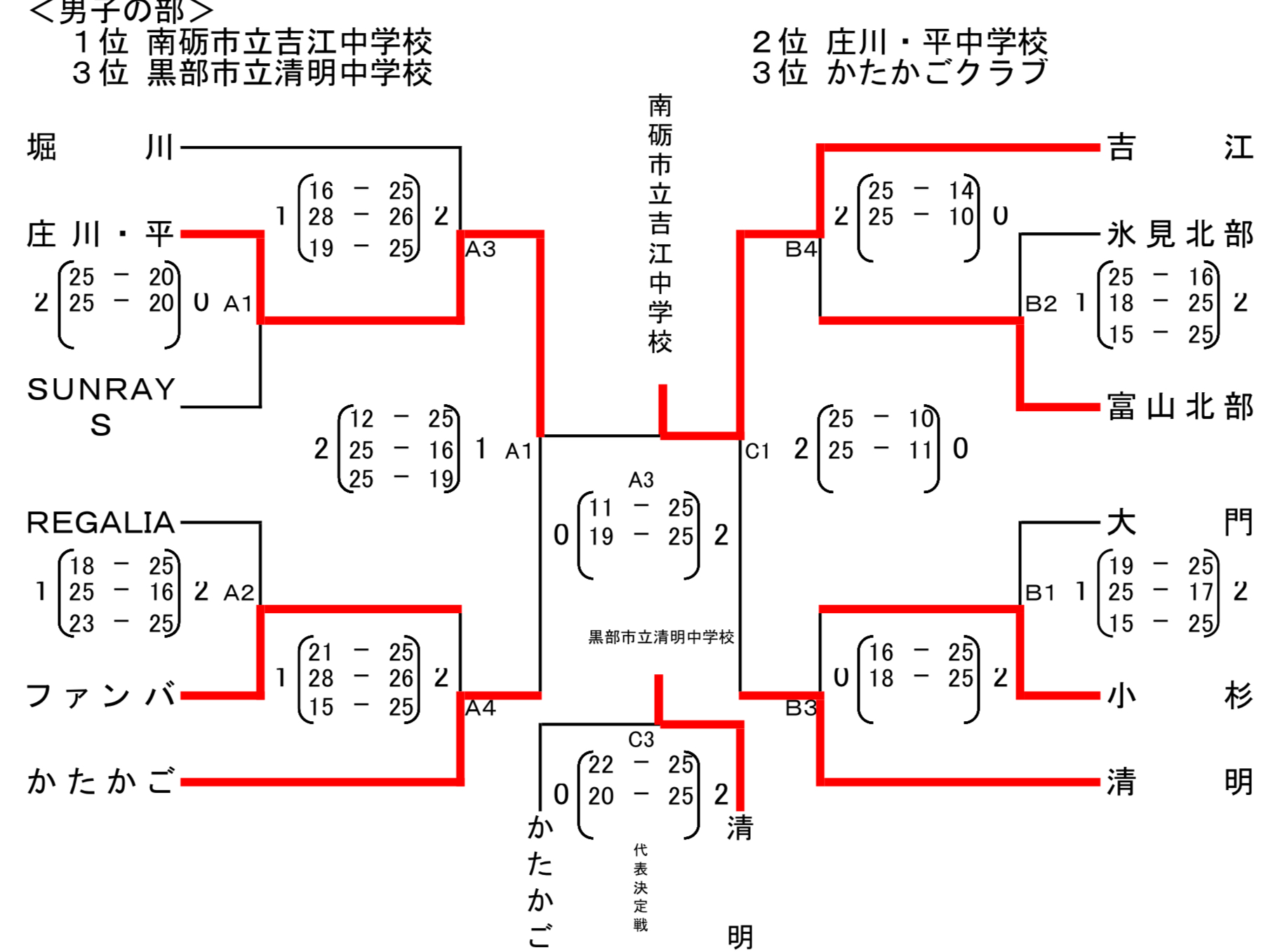 | 氷見北部 | 1 | 16-25 25-18 25-15 | 2 | 富山北部 |