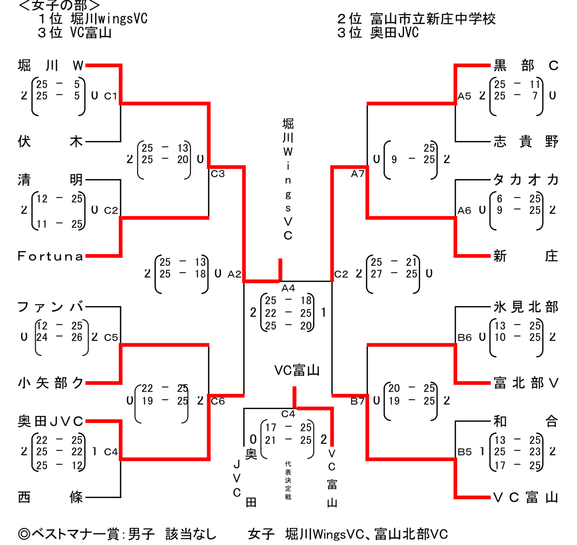 | 堀川w | 2 | 25-5 25-5 | 0 | 伏 木 |