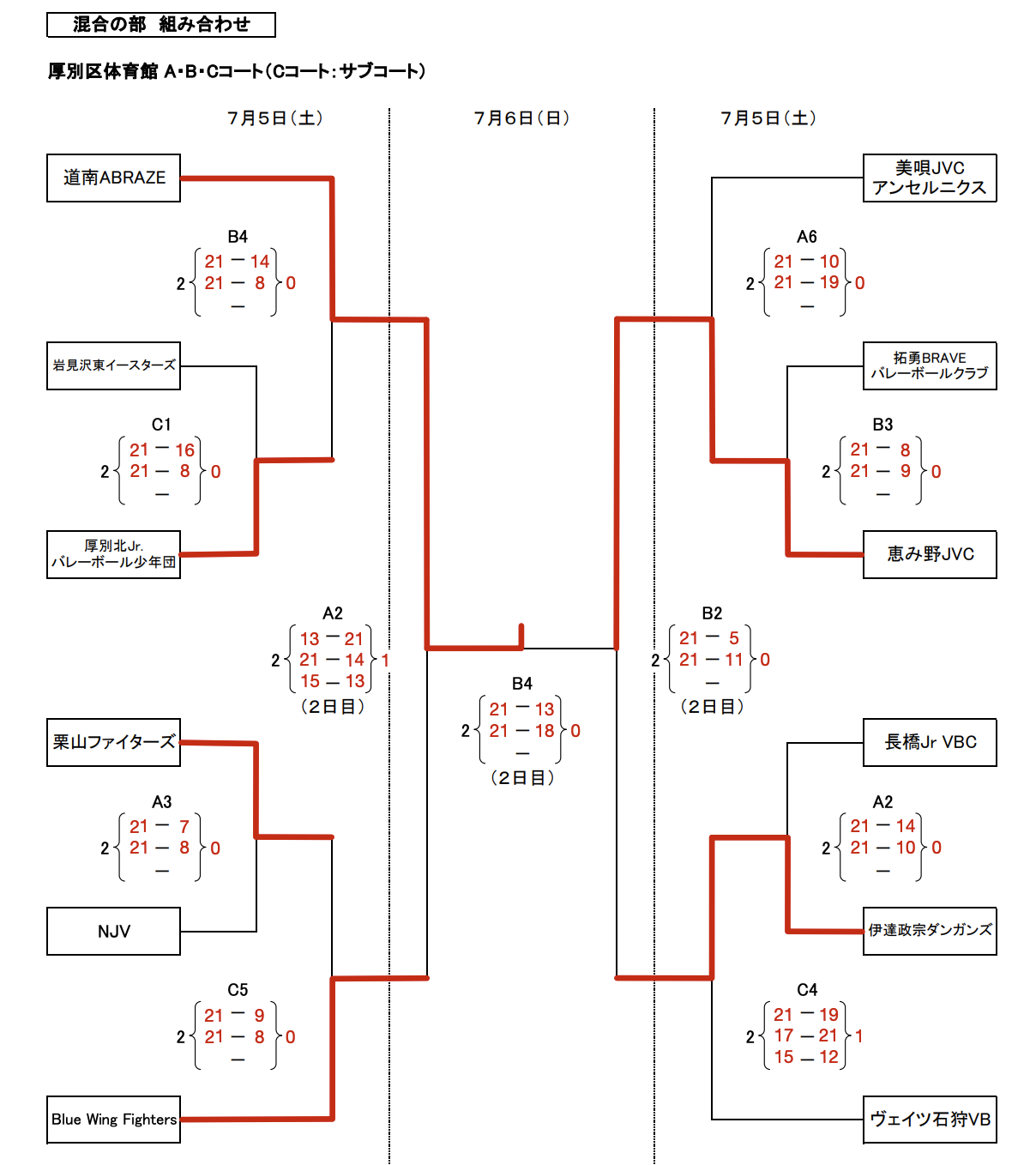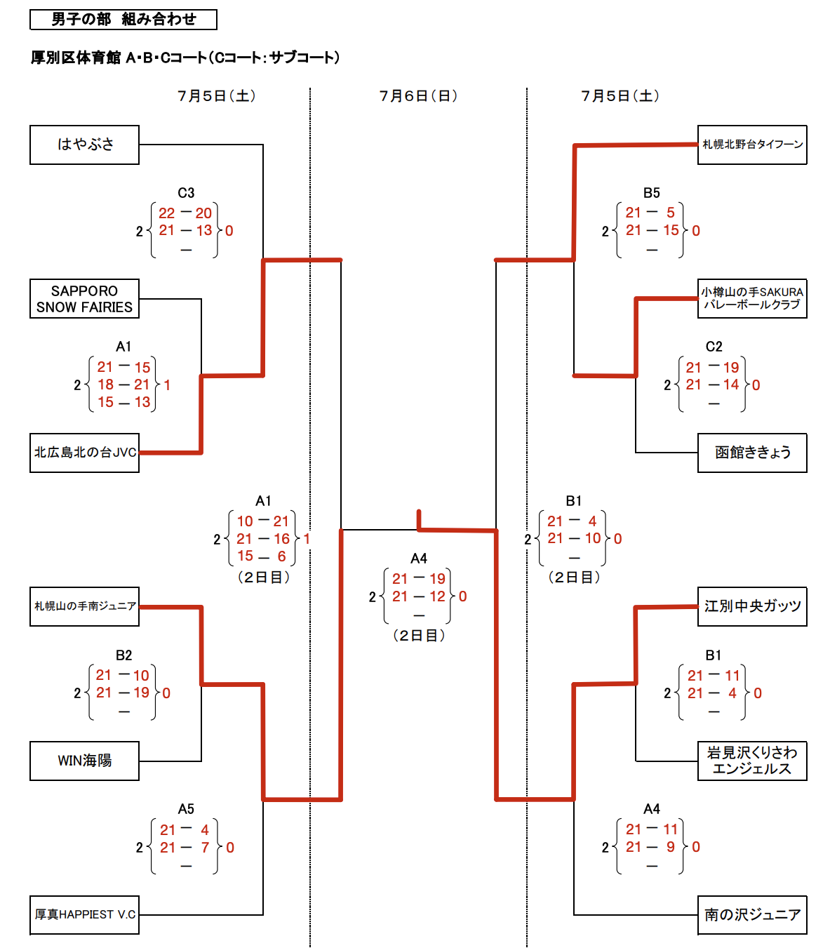 | 北広島北の台JVC | 1 | 21-10 16-21 6-15 | 2 | 札幌山の手南ジュニア |